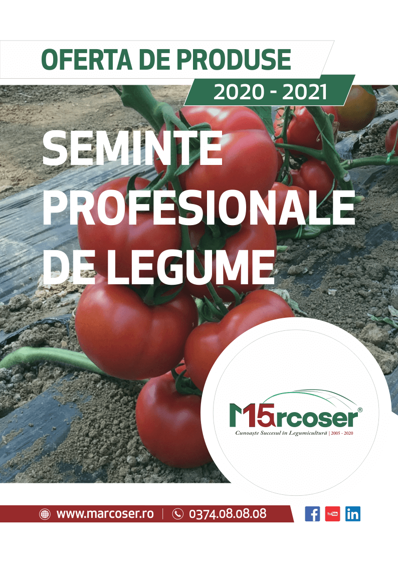 Detinem o varietate mare de seminte de legume atat pentru cultivarea in solar cat si pentru cultivarea in camp fapt ce ne permite sa facem recomandari adaptate la nevoile specifice ale fermierilor. Toata gama de seminte din portofoliul Marcoser poate fi consultata in catalogul dedicat - Seminte profesionale de legume. Rasfoind acest catalog, fermierii pot obtine cele mai importante caracteristici ale hibrizilor, noutatile acestui sezon precum si recomandarile Marcoser pentru fiecare categorie. De asemenea, in acest catalog, punem la dispozitia fermierilor si fotografii din cultura pentru hibrizii pe care i-am testat la ferma Marcoser dar si video-uri de prezentare.