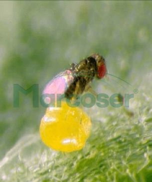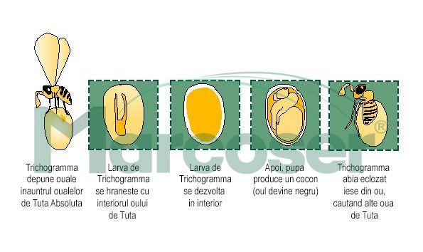Femela Trichogramma depune ouale in interiorul oualor de Tuta Absoluta (molia miniera a tomatelor), distrugandu-le din interior, iar in acest mod impiedica eclozarea larvelor.
