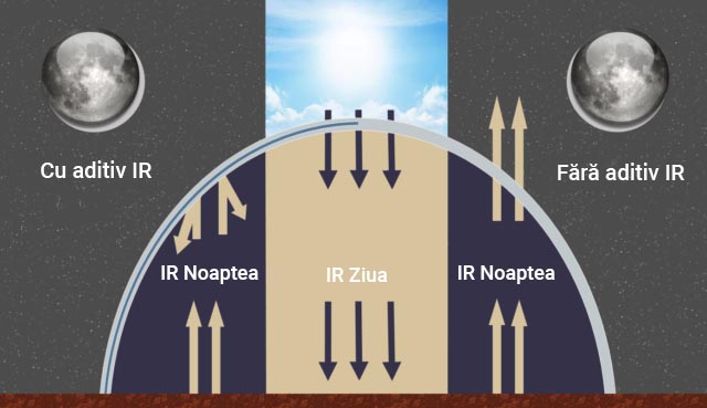 IR – este aditivul din componenta foliei care blocheaza sau impiedica pierderea de caldura acumulata in timpul zilei. Aceasta proprietate se numeste “efect termic”.