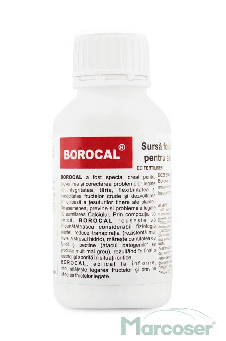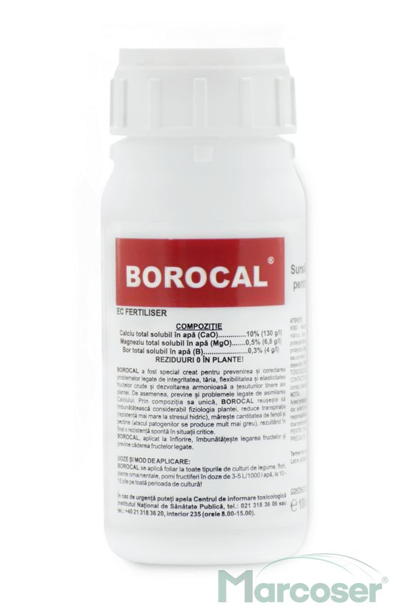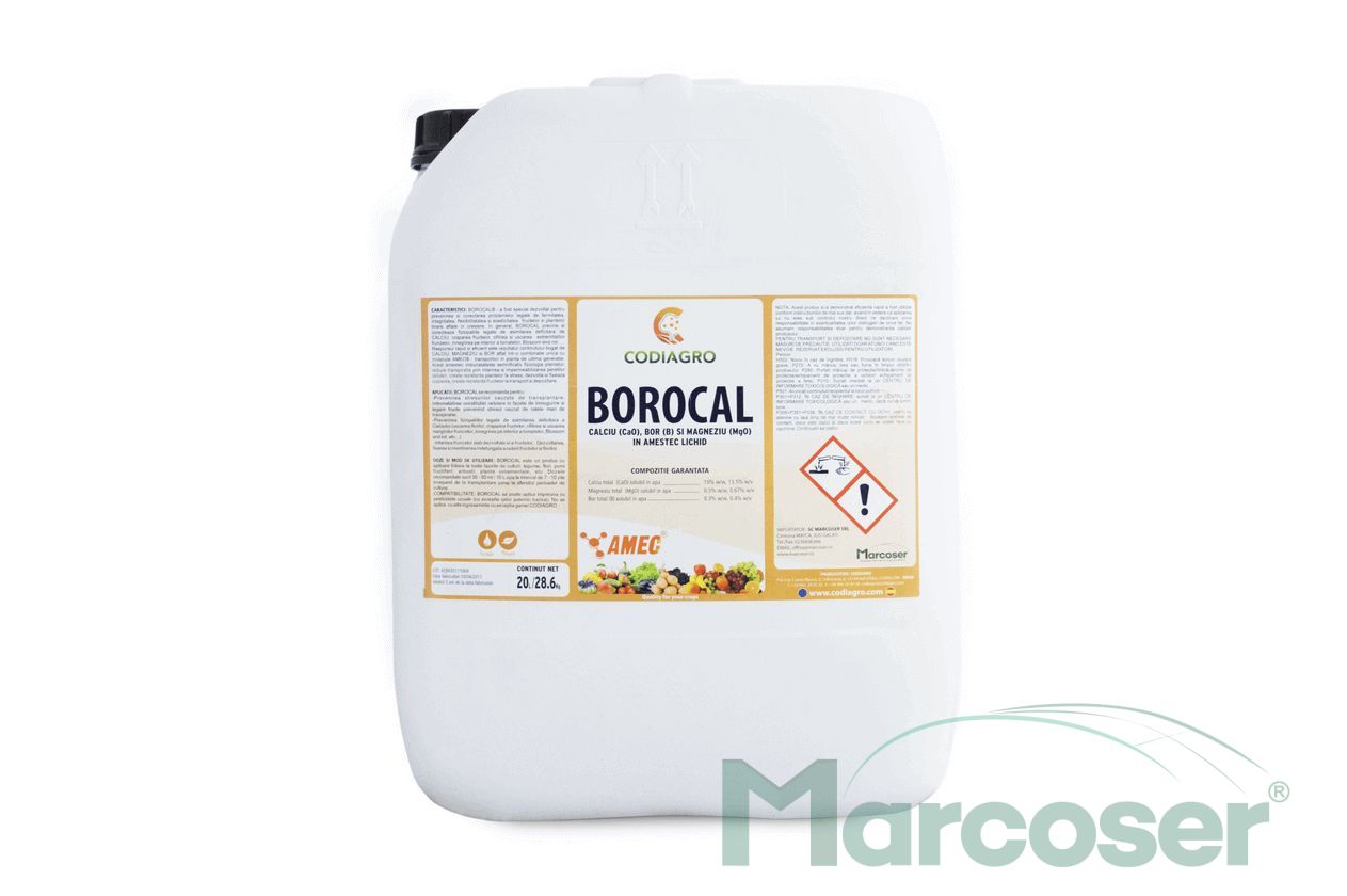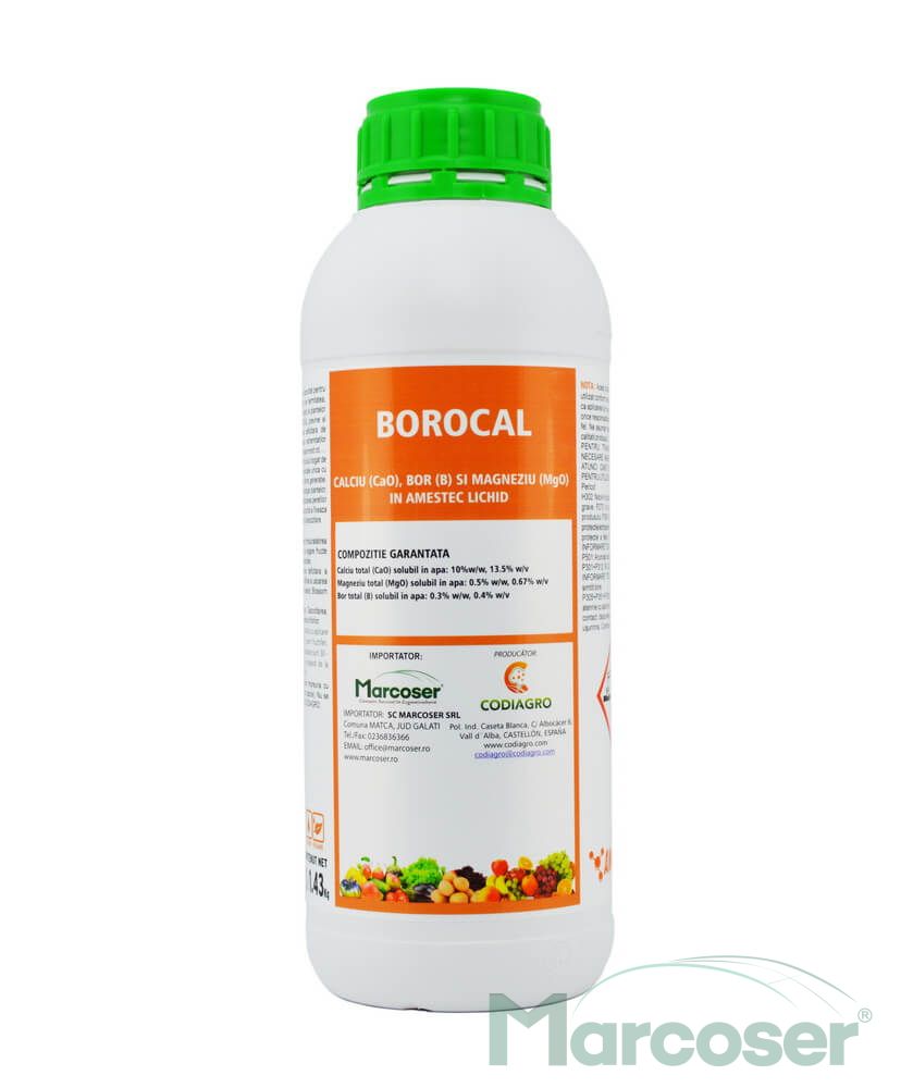 Borocal este un fertilizator foliar pe baza de Calciu, Bor si Magneziu, utilizat la toate culturile horticole pentru corectarea deficientelor de Calciu, Bor, Magneziu si de asemenea pentru cresterea calitatii fructelor. Se aplica in toate fazele de dezvoltare pentru reducerea stresului la plante, cresterea viabilitatii florilor si obtinerea de fructe ferme, uniform colorate.