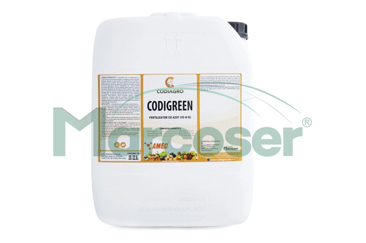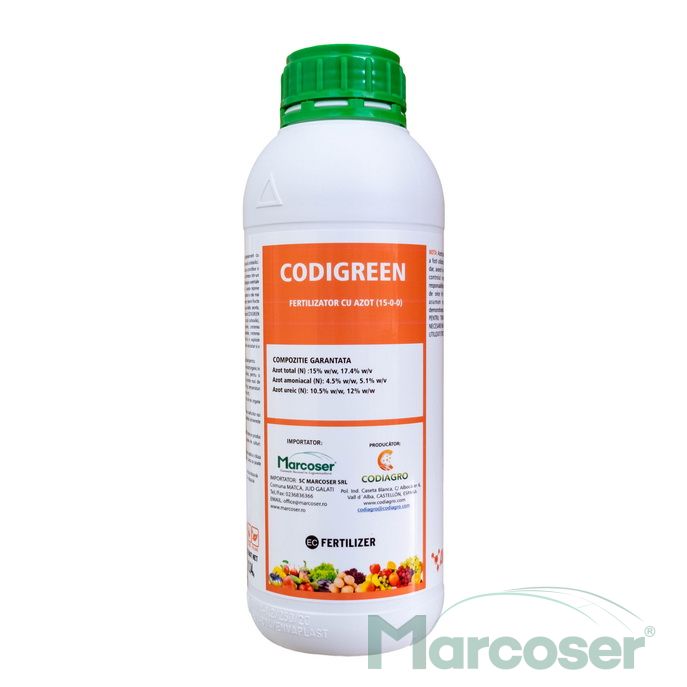 Codigreen este un ingrasamant organic cu un continut ridicat de carboxilati de amoniu, recomandat pentru furnizarea pe cale foliara a unei forme asimilabile si sigure de azot, imbunatatirea diviziunii celulare in perioadele cheie ale dezvoltarii plantei si organelor productive si pentru reducerea problemelor de alternanta a tratamentelor foliare.
