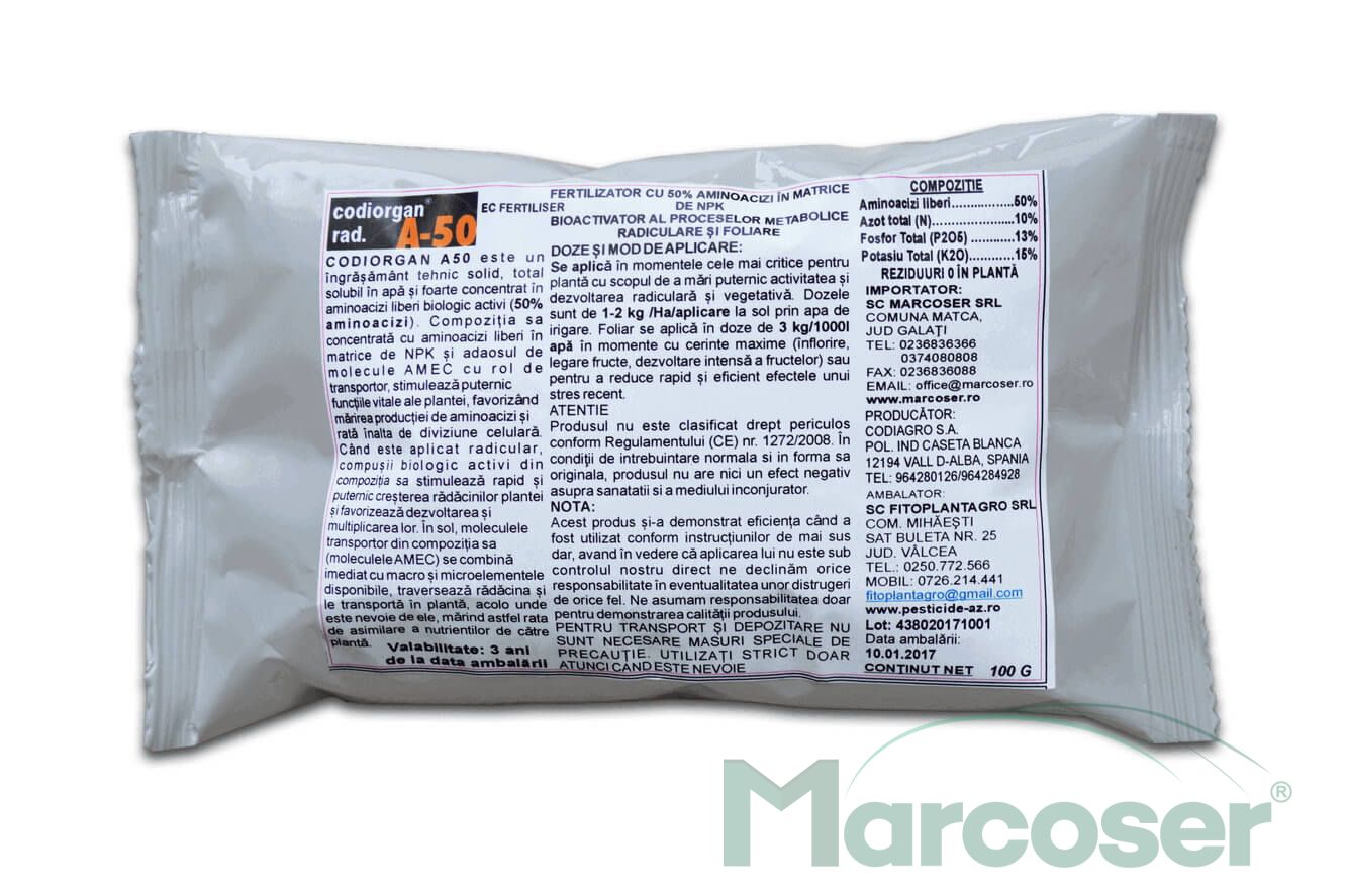 Codiorgan A-50 este un ingrasamant solid, solubil in apa si foarte concentrat in aminoacizi liberi, biologic activi.