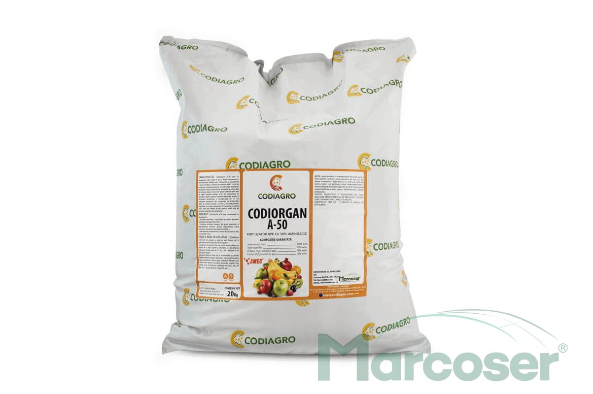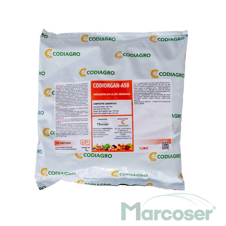 Codiorgan A-50 este un ingrasamant solid, solubil in apa si foarte concentrat in aminoacizi liberi, recomandat pentru stimularea dezvoltarii radiculare si imbunatatirea metabolismului plantei in fazele critice (inflorire, legare fructe, cresterea intensiva a fructelor, maturarea), facilitand transportul nutrientilor in planta.