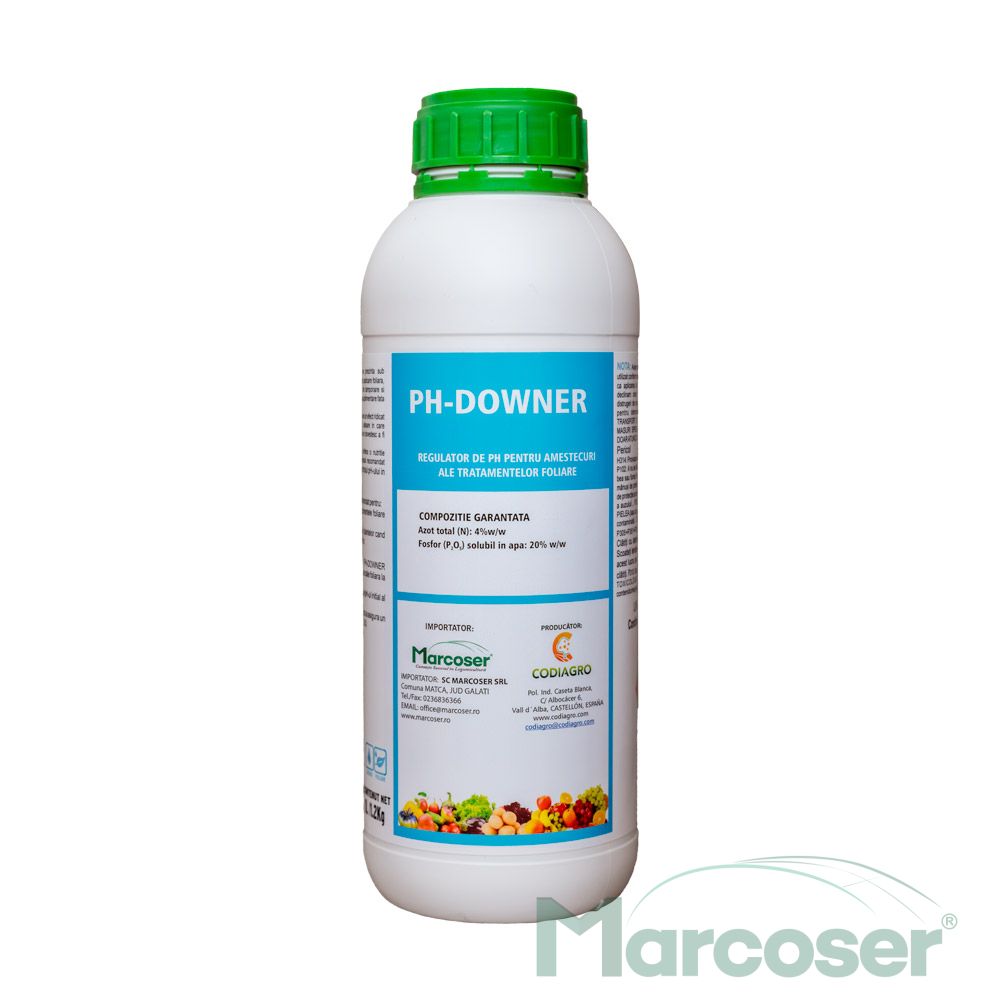 PH-downer se prezinta sub forma unui fertilizator cu Azot si Fosfor pentru aplicare foliara, ce este recomandat pentru tamponarea pH-ului solutiilor in tratamentele foliare cu substante chimice si pentru ajutarea, prin frunze, la ciclul fenologic al plantelor cand acestea au mare nevoie de Azot si Fosfor.