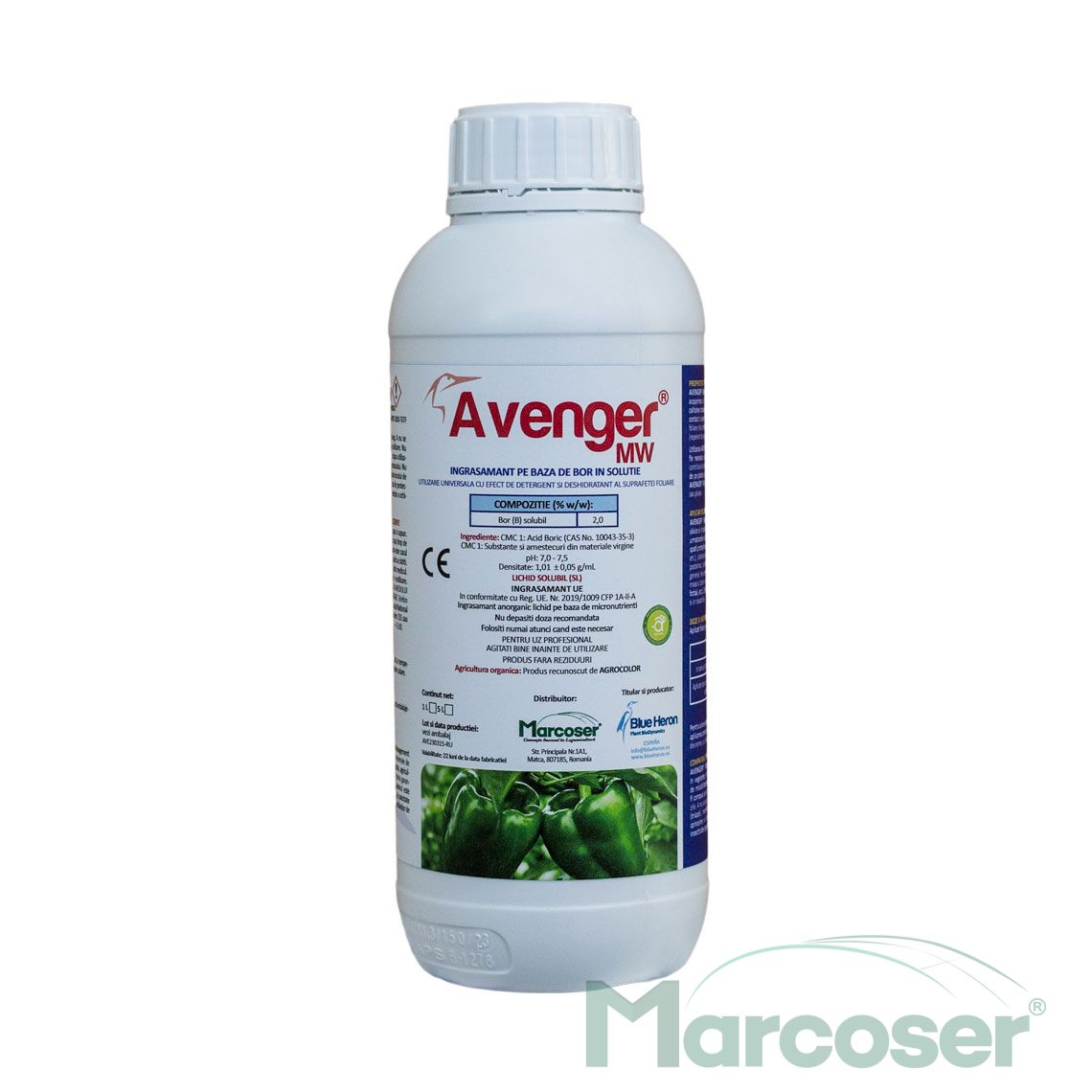 Avenger MW este o solutie nutritiva lichida care contine Bor, ce faciliteaza acoperirea si umectarea frunzelor, tulpinilor si fructelor, imbunatatind astfel calitatea tratamentului si aderenta produselor la nivelul culturii.