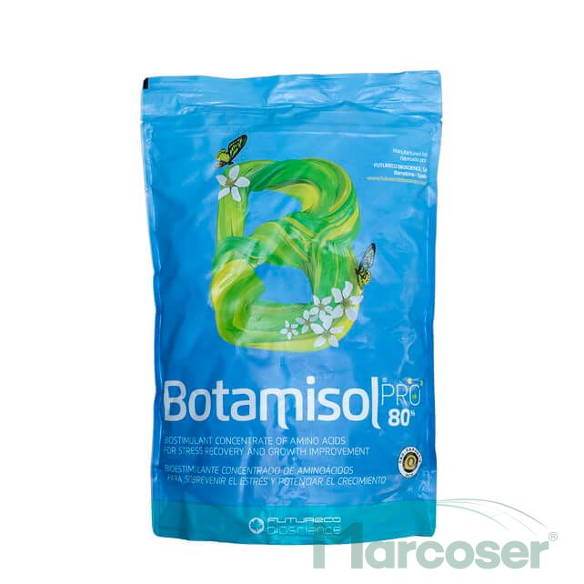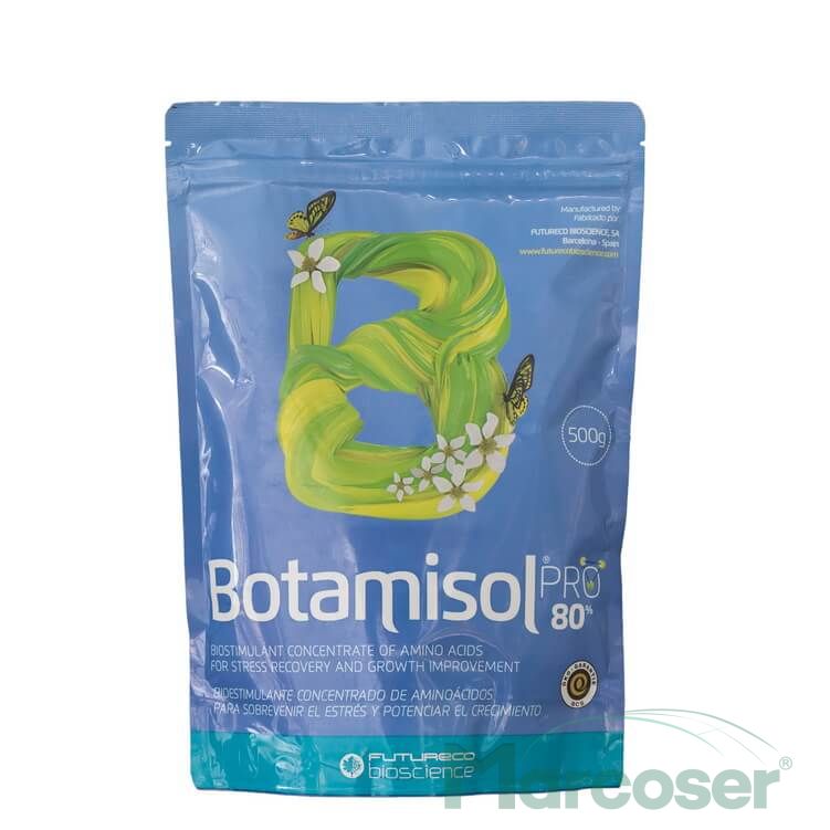 Botamisol 80Pro este un biostimulator organic cu o concentratie de 80% L-Aminoacizi liberi, total solubili, obtinuti printr-un proces de dubla hidroliza enzimatica a proteinelor vegetale, proces ce garanteaza o aminograma completa, cu toti aminoacizii necesari cresterii si dezvoltarii optime a plantelor.