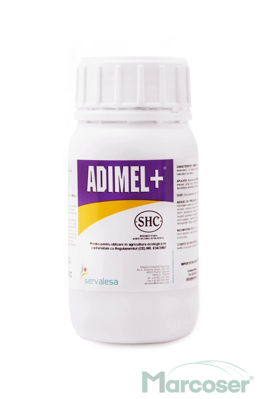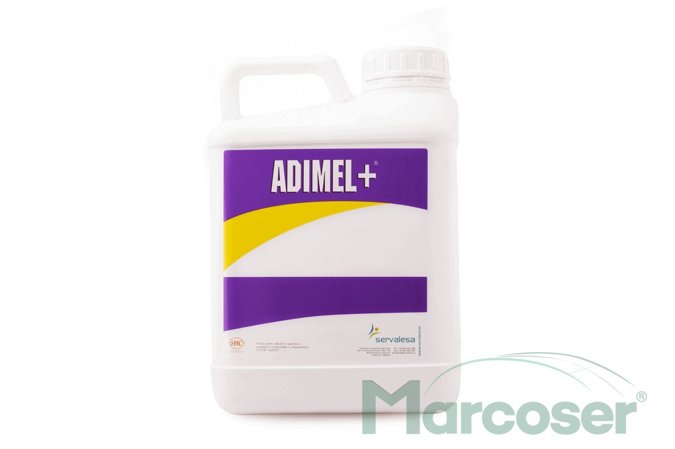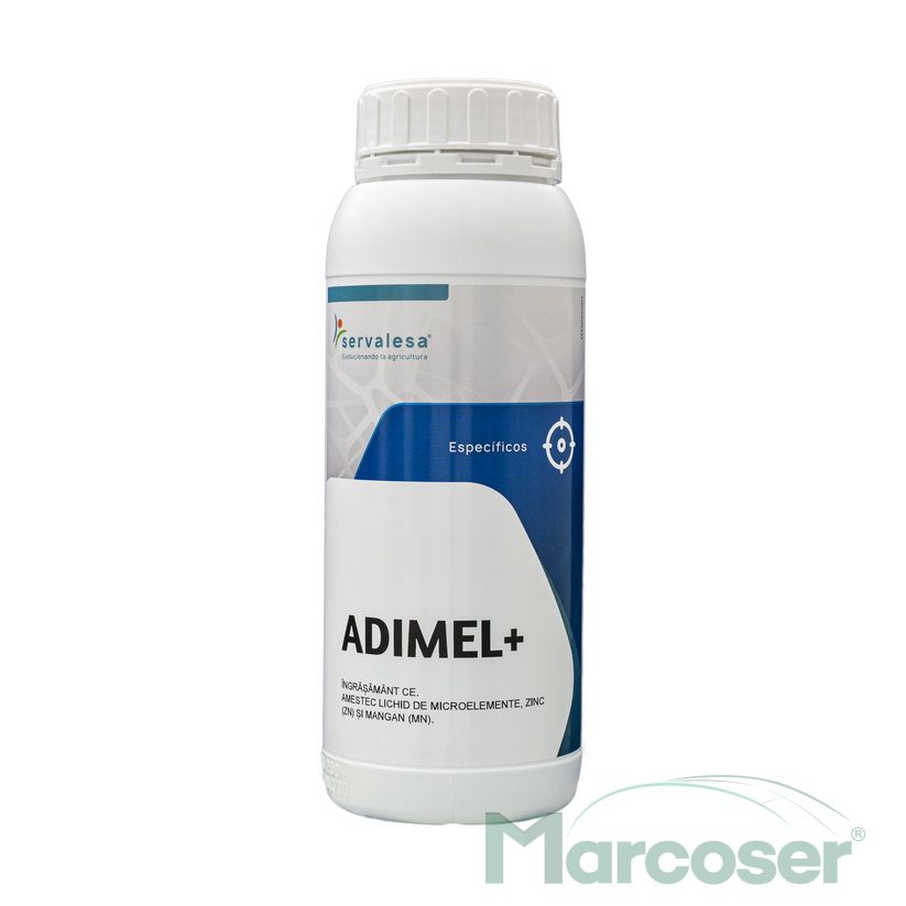 Adimel + este o solutie de fertilizare (ingrasamant lichid hidrosolubil) stabila pe baza de zinc si mangan in forma moleculara, ce asigura produsului o buna absorbtie atunci cand este aplicat pe cale foliara.