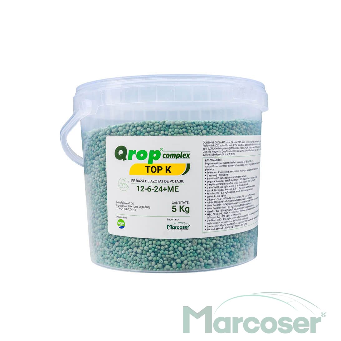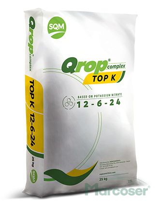 Qrop Complex Top K elibereaza rapid nutrientii în contact cu apa, asigurand astfel o sursa echilibrata de azot (N), fosfor (P), potasiu (K), calciu (Ca), magneziu (Mg), si sulf (S), gama completa de macroelemente.