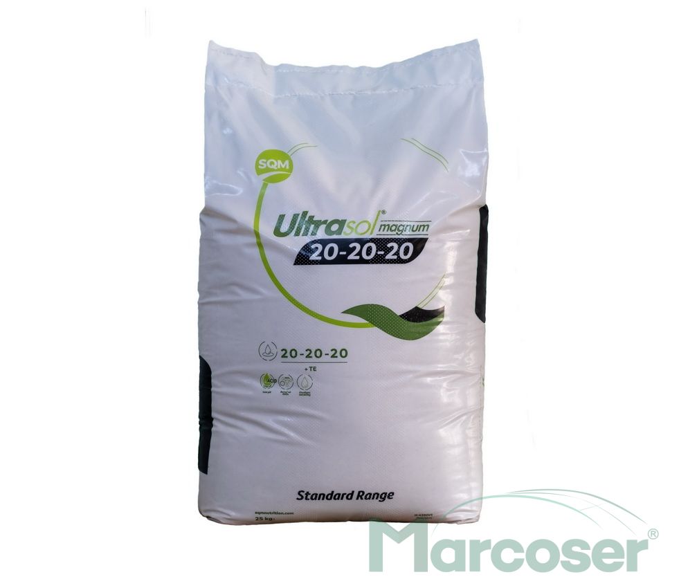 Ultrasol Magnum Special 20:20:20 este un produs ce se utilizeaza in planul de fertilizare pe timpul tuturor fazelor de crestere si dezvoltare, continand o gama completa de macro si microelemente. Produsele din gama Ultrasol Magnum Special sunt formule puternic acidifiante si reduc continutul de bicarbonat si pH-ul solului si al apei.