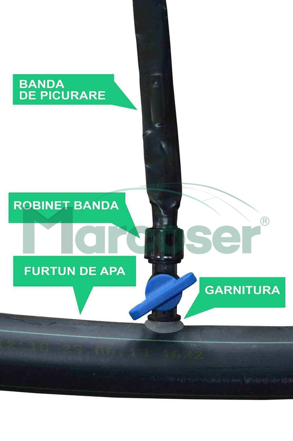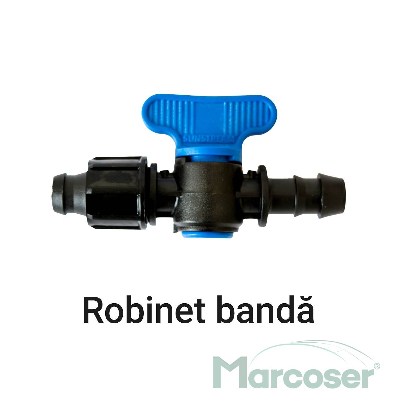 2. Robinet banda picurare (minivalve), se utilizeaza ca si start conectorii ca piese de legatura intre teava de apa si banda de picurare. Pot fi utilizati pentru instalatie de irigare prin picurare tip banda dar si pentru cea instalatie de irigare prin picurare tip TUB. Avantajul utilizarii robinetului in montarea sistemelor de irigare prin picurare este ca poate fi oprita complet irigarea pe randul respectiv. Pentru a lega robinetul de teava de apa este necesara o garnitura!