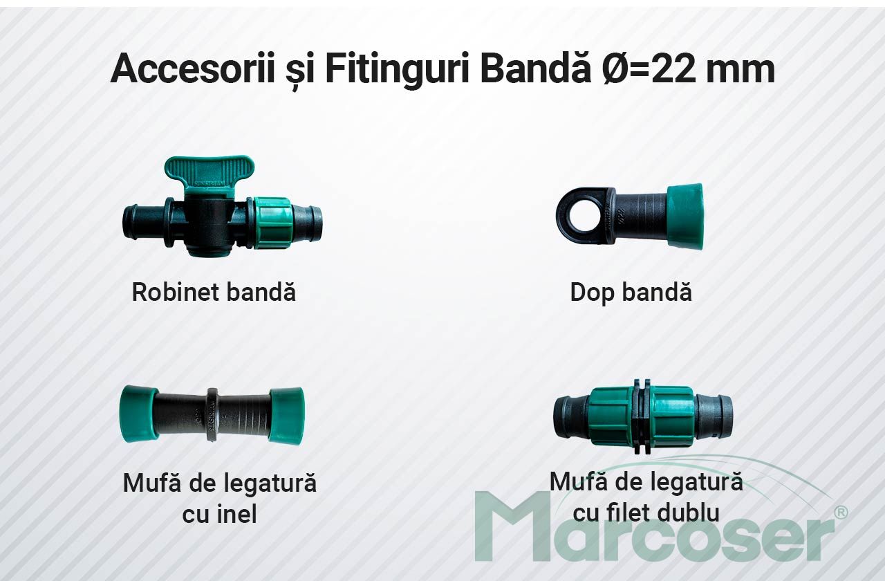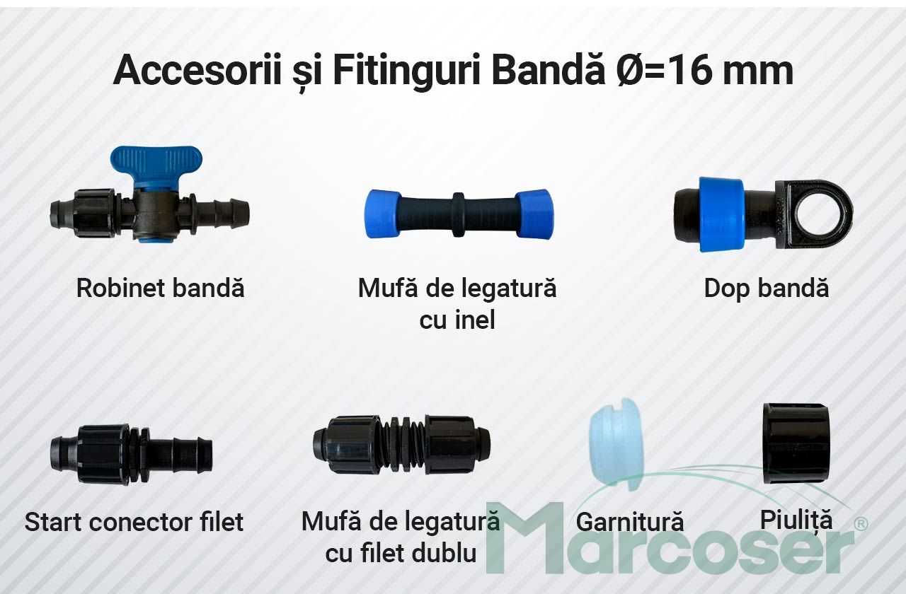 Accesorii si fitinguri pentru instalatia de irigare cu banda cu distante intre picuratori de la 10 la 40 cm. Realizeaza o udare eficienta a plantelor.