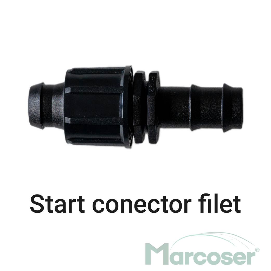 1. Start conector pentru banda, piesa de legatura intre teava de apa si banda de irigare. Acest conector poate fi cu filet sau cu inel. Acest tip de conectori se utilizeaza pentru instalatia de irigare prin picurare tip banda. Pentru a lega start conectorul de teava de apa este necesara o garnitura!