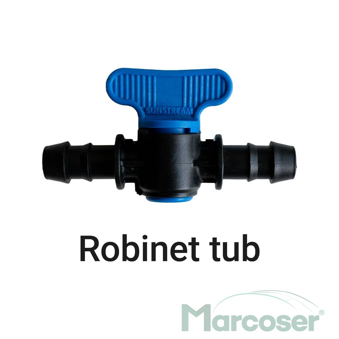 2. Robinet pentru tubul de irigare (minivalve), se utilizeaza ca si start conectorii ca piese de legatura intre teava de apa si tubul de irigare prin de picurare. Pot fi utilizati pentru instalatie de irigare prin picurare tip tub dar si pentru instalatie de irigare prin picurare tip banda. Avantajul utilizarii robinetului in montarea sistemelor de irigare prin picurare tip tub este ca poate fi oprita complet irigarea pe randul respectiv. Pentru a lega robinetul de teava de apa este necesara o garnitura!