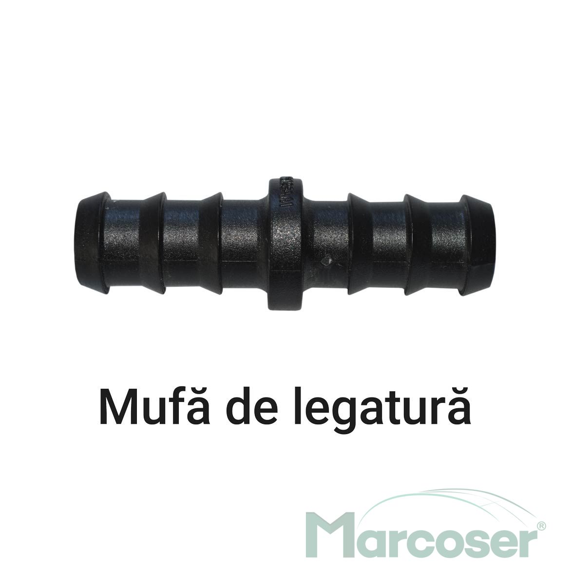 3. Mufa de legatura pentru tub este piesa utilizata pentru unirea a doua tuburi care fac parte din acelasi rand al instalatiei de irigare prin picatura. Se utilizeaza atunci cand se doreste marirea randului irigat sau in cele mai multe cazuri atunci cand instalatie este deteriorata din diverse motive (taiate, zgaraiate, muscate de coropisnite sau alte animale, etc).