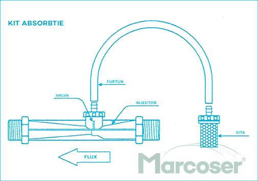 Kit-ul profesional de absorbtie este compus din 2 metri de furtun, fitting plastic pentru furtun, sita.