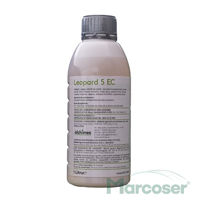 Vezi descriereLeopard 5 EC este un erbicid postemergent, folosit pentru combaterea buruienilor monocotiledonate anuale şi perene. Acesta este rapid absorbit prin suprafaţa frunzelor buruienilor graminee, după câteva ore de la aplicare constatându-se o translocare în ambele sensuri prin xilem şi floem.