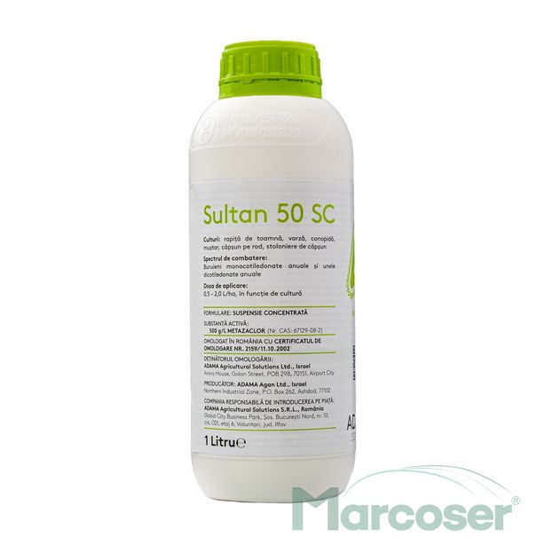 Sultan 50 SC contine metazaclor, substanta activa din grupa cloroacetanilide, care combate un spectru larg de buruieni cu rasarire din samanta. Remanenta produsului este destul de indelungata, astfel ca prin efectul sau rezidual protejeaza culturile de noi valuri de imburuienare pana la incheierea randurilor.