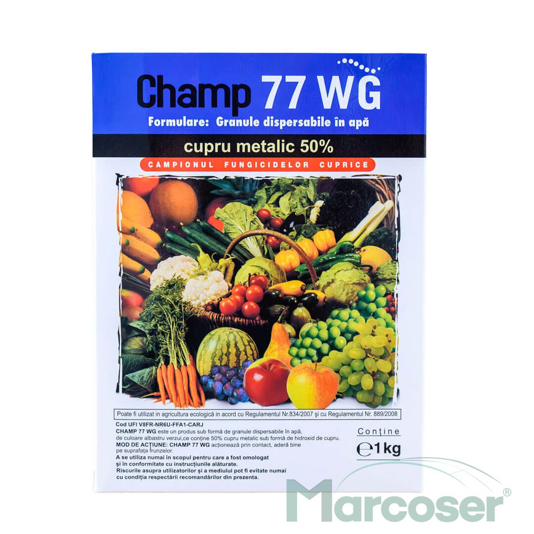 Champ 77 WG este un fungicid/bactericid ce se prezinta sub forma de granule fine, omogene, fara tendinta de sfaramare, de culoare bleu vernil. Acesta stimuleaza rezistenta naturala a plantelor, contribuind la combaterea integrata a patogenilor, in strategia impotriva crearii rezistentei la fungicidele sistemice, acesta avand efect fungicid si batericid.