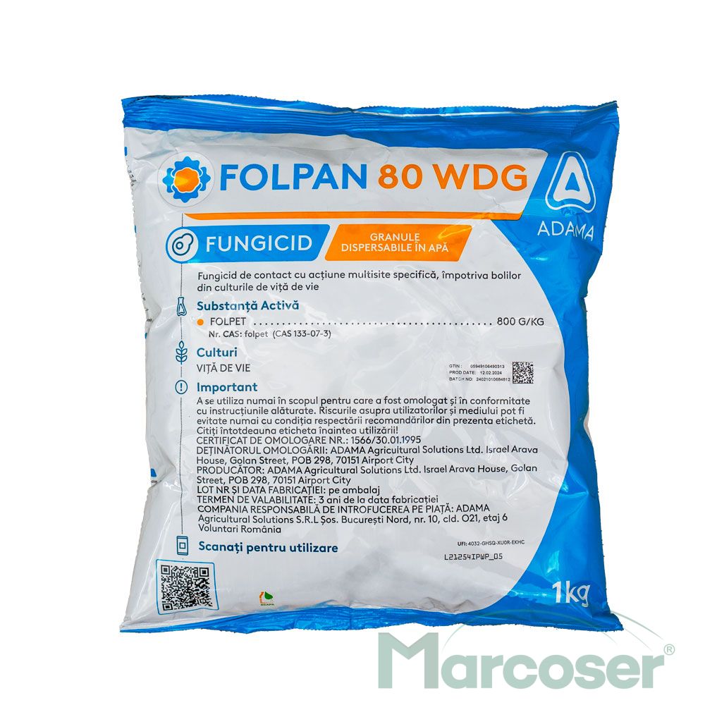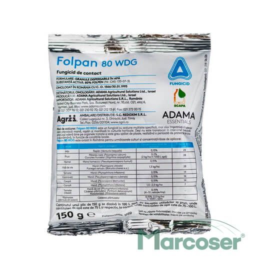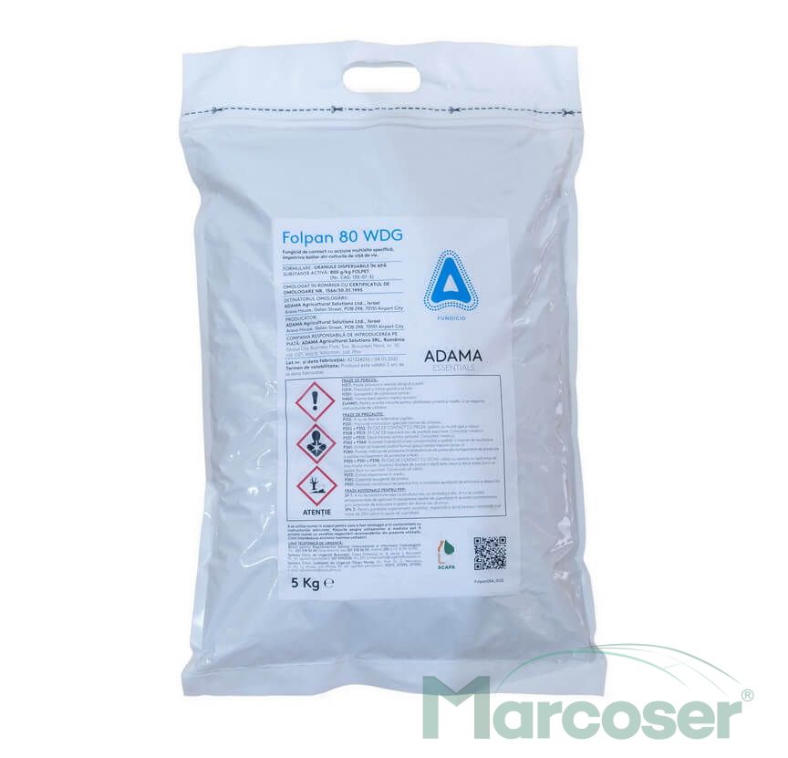 FOLPAN 80 WDG este un fungicid de contact cu actiune multi-site, specifica mai ales impotriva ciupercilor care provoaca mana, rapanul si monilioza la culturile horticole. Acesta are actiune preventiva de contact, impiedicand instalarea infectiilor la suprafata organelor tratate prin blocarea respiratiei ciupercilor sensibile la nivel celular.