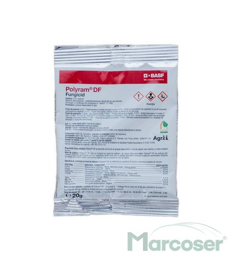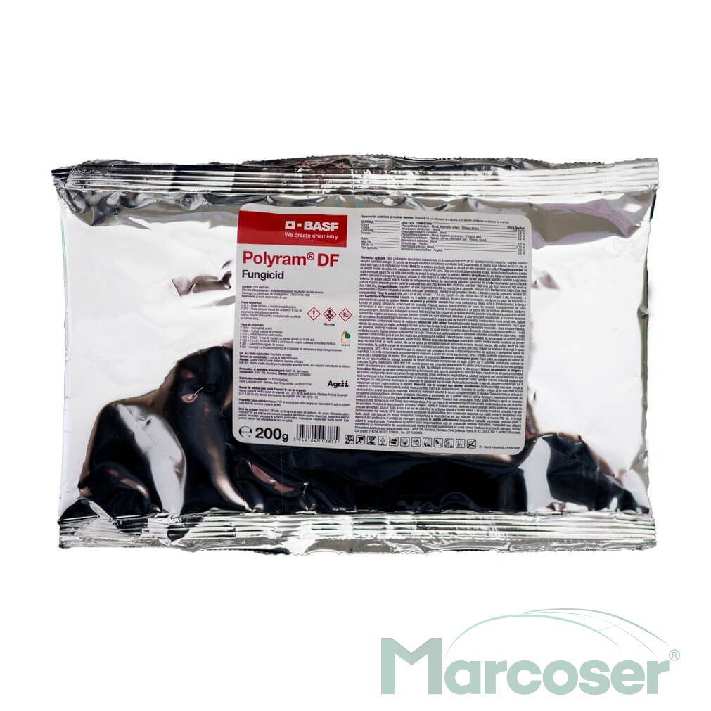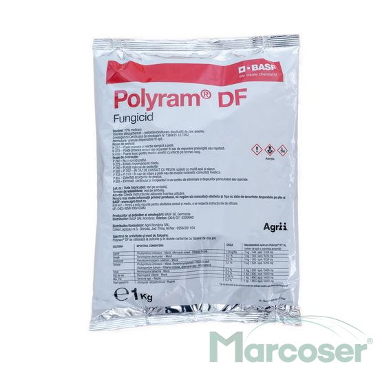 Polyram DF este un fungicid de contact cu actiune multi-site pe baza de metiram, din grupa ditiocarbamatilor. Produsul impiedica germinarea sporilor ciupercilor si are spectru larg de combatere a bolilor. Fiind un fungicid de contact, tratamentele trebuie facute preventive.