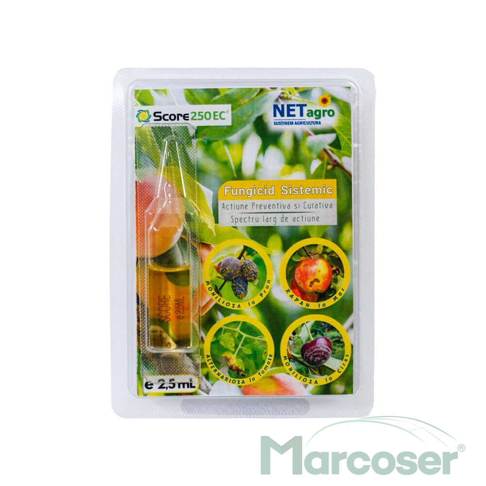 Score 250 EC este un fungicid sistemic universal, consacrat pentru combaterea bolilor la pomii fructiferi, tomate si alte culturi, avand actiune preventiva si curativa. Acesta blocheaza dezvoltarea miceliului in tesutul vegetal si inhiba sporularea.