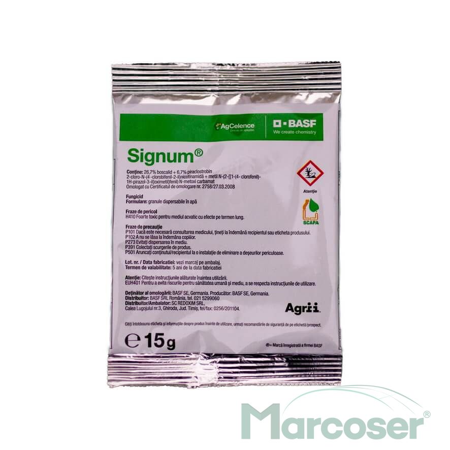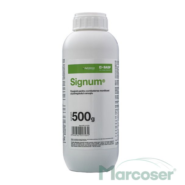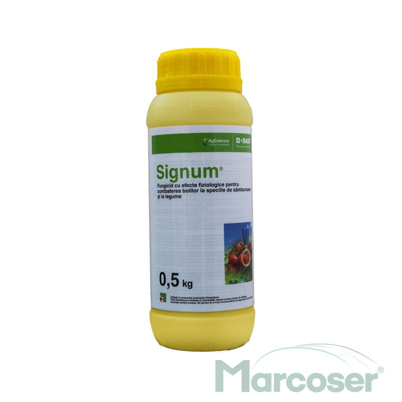 Signum este un fungicid inovator, cu o combinatie unica de doua substante active noi, cu moduri de actiune diferite: boscalid, din grupa carboxamide si piraclostrobin (substanta activa renumita din grupa strobilurinelor).