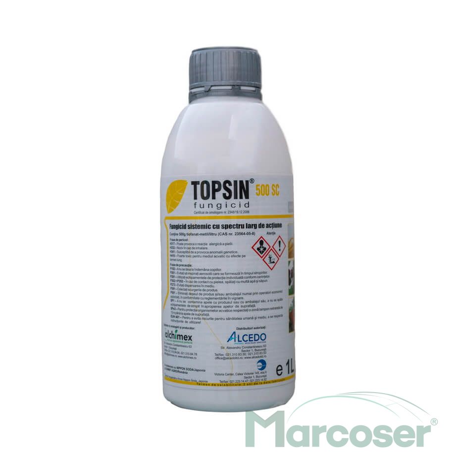 Topsin 500 SC este un fungicid cu actiune de contact si sistemica, fiind absorbit de plante prin frunze si radacini, avand un foarte bun efect preventiv si curativ fata de un spectru larg de agenti fitopatogeni care provoaca boli ale plantelor, cu infectie de suprafata si sistemica.