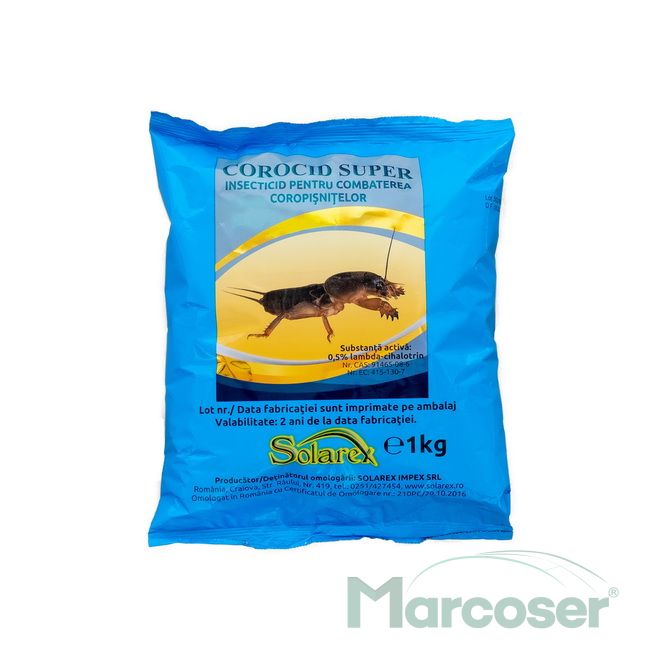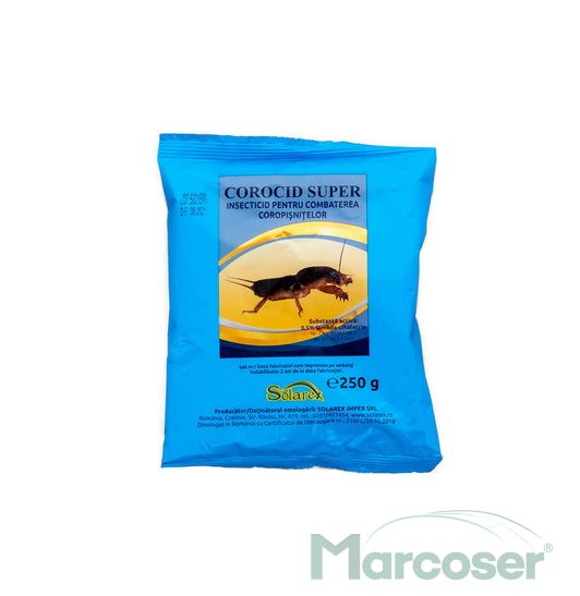 Corocid Super este un insecticid pentru combaterea coropisnitelor sub forma de momeala granulata, de culoare albastru-verde, cu miros caracteristic. Pentru o mai buna eficienta, se aplica prin incorporare, prin imprastiere uniforma in benzi sau sub forma de gramajoare aplicate la baza plantei.