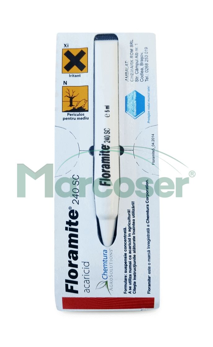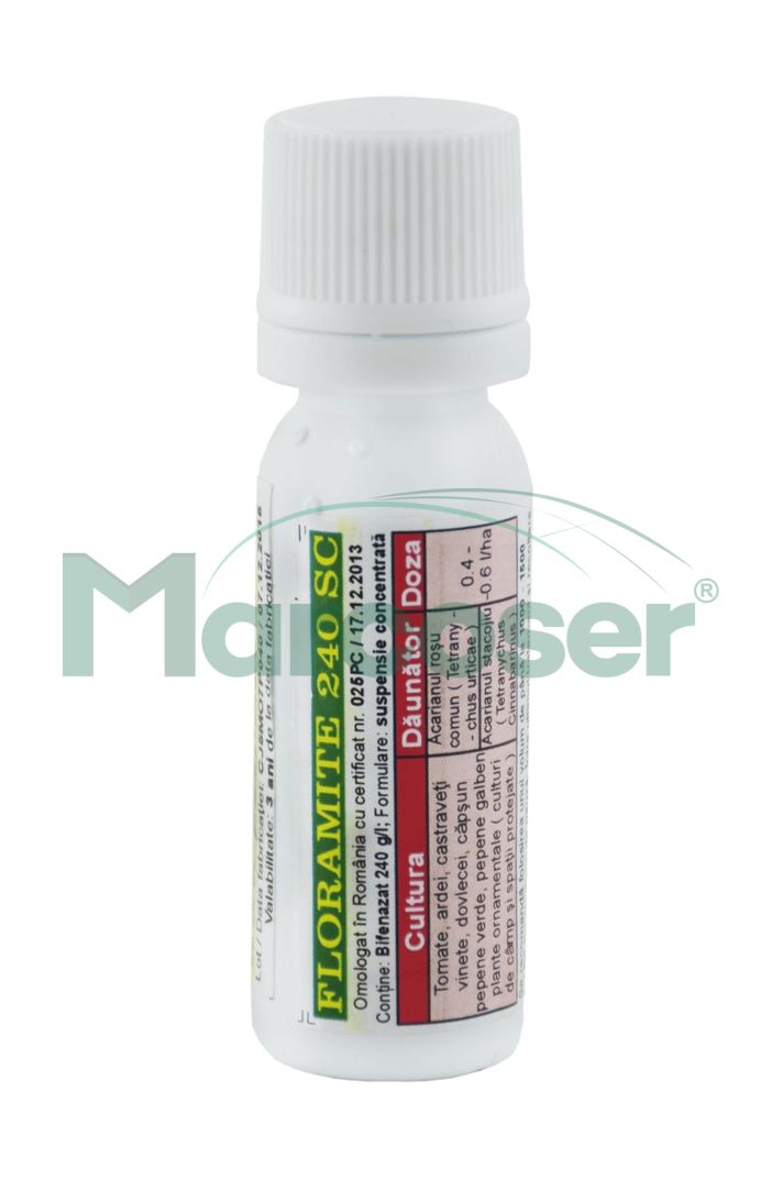 Vezi descriereFloramite 240 SC controleaza toate formele mobile ale acarienilor, avand si efect ovicid asupra acestora. Produsul are efect letal prin actiunea de contact, urmat de o lunga activitate reziduala asupra daunatorilor. La 3 ore dupa aplicare, acarienii inceteaza sa se mai hraneasca, iar efectul letal se instaleaza in decurs de 3-4 zile