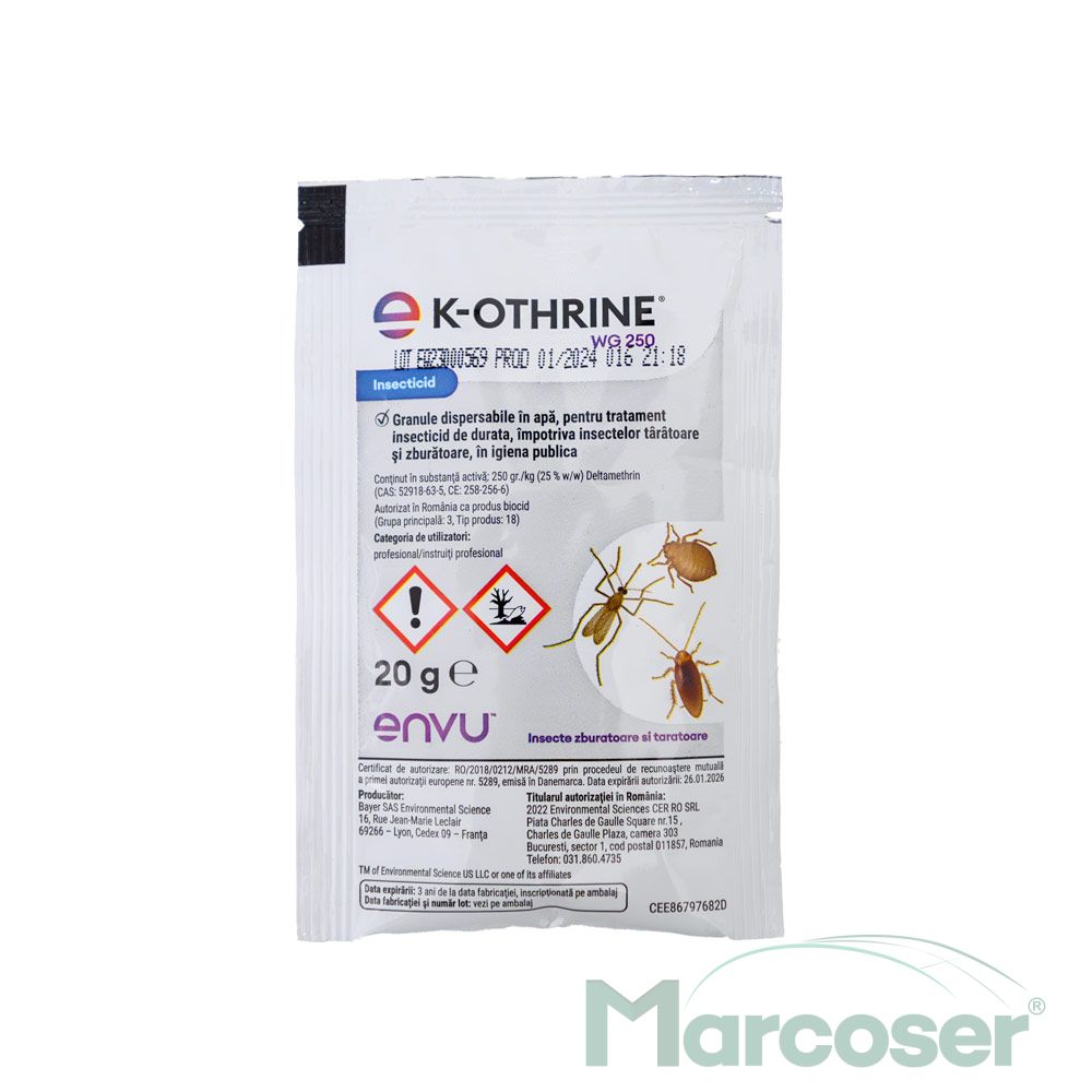 K-Othrine WG250 este un insecticid granulat superconcentrat, de culoare bej-galbui, destinat combaterii insectelor zburatoare si taratoare in sectorul de igiena publica (dezinsectie). Acesta se utilizeaza in exterior si in interiorul tuturor incintelor locuite sau industriale pentru combaterea mustelor, tantarilor, plosnitelor, gandacilor de casa, furnicilor, puricilor, moliilor si paianjenilor.