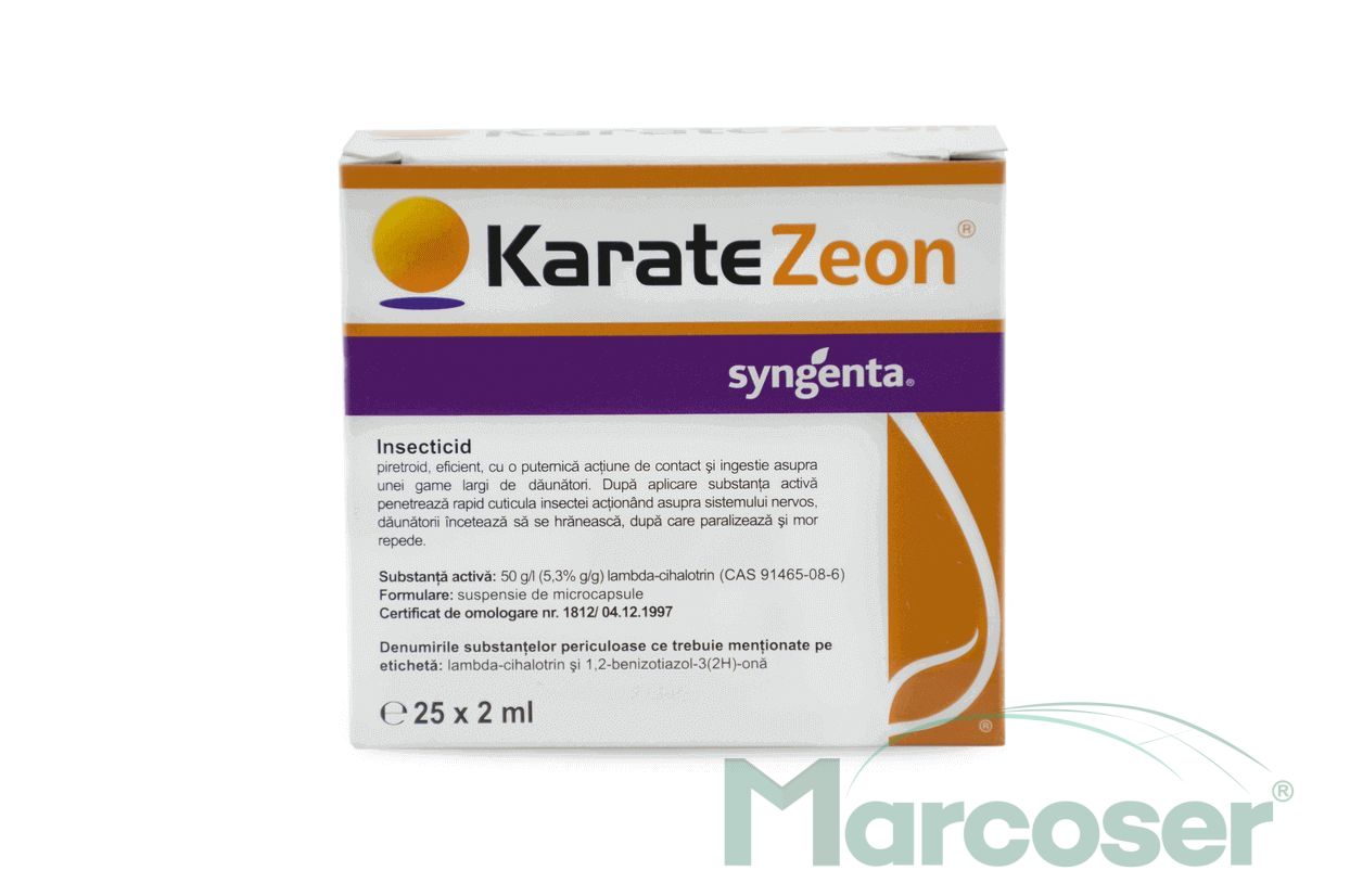 Karate Zeon este insecticid de contact care, pe langa efectul rapid si de soc impotriva daunatorilor, ofera cea mai lunga perioada de protectie, datorita tehnologiei Zeon. Tehnologia Zeon permite protejarea substantei active in formatiuni numite “zeoni”, aflate in solutie apoasa.