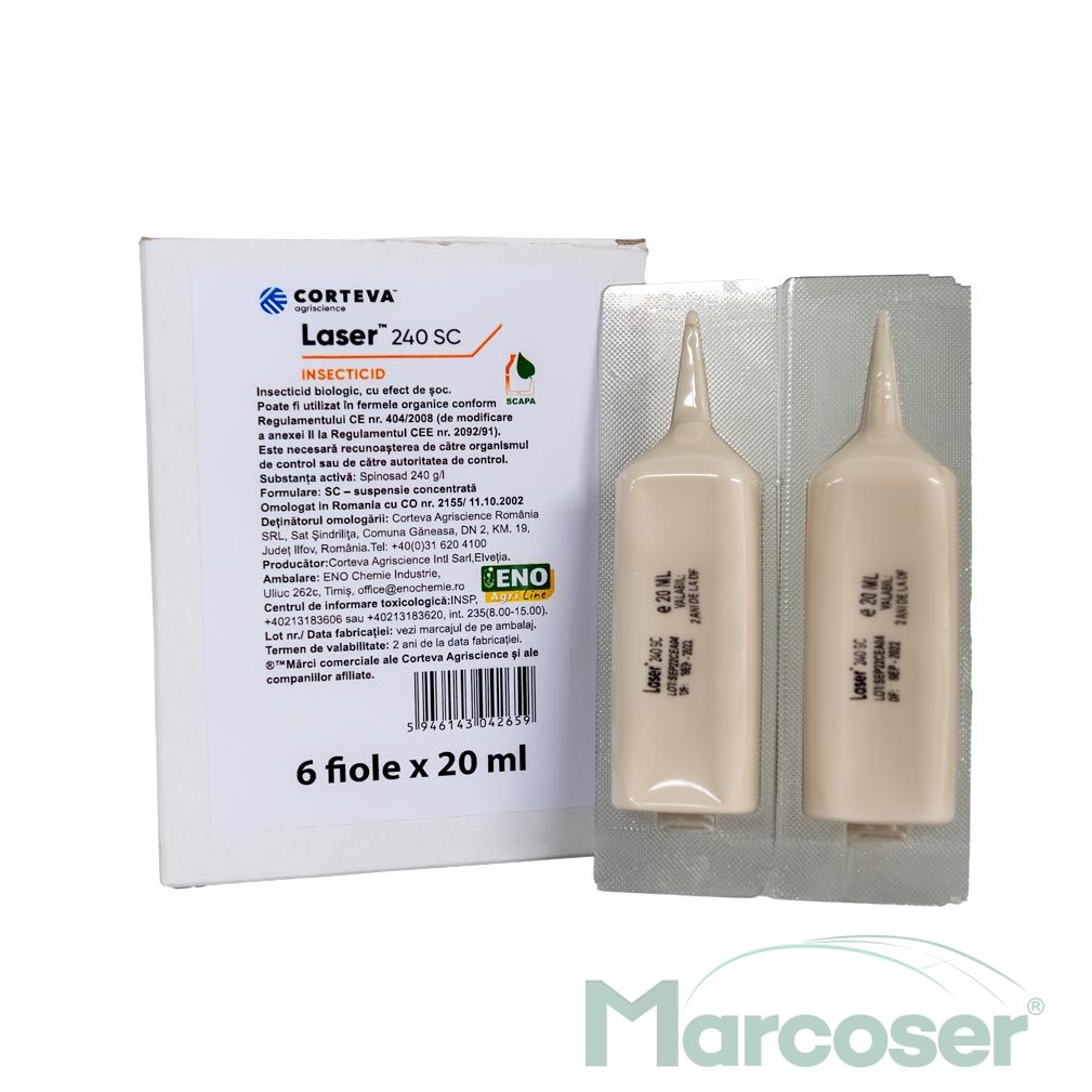 Vezi descriereLaser 240 SC este un insecticid biologic cu efect de soc, cu actiune prin contact si ingestie, avand si efect ovicid la unele specii. Acesta are eficacitatea insecticidului sintetizat chimic (are eficacitate similara piretroizilor si superioara organofosforicelor si altor insecticide sintetizate chimic).