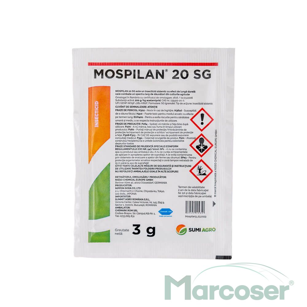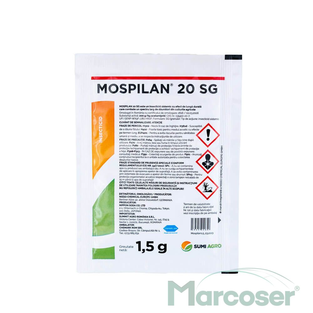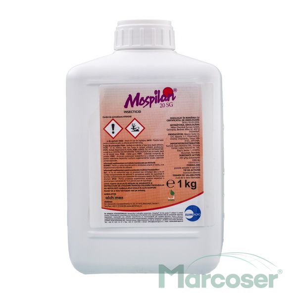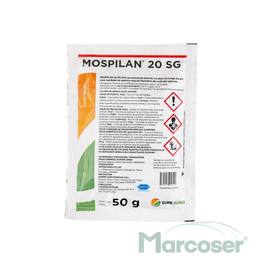 Vezi descriereMospilan 20 SG combate toate stadiile de dezvoltare (ou - larva - adult), are efect rapid, afectand sistemul nervos al insectelor care paralizeaza si mor, este absorbit rapid în planta iar eficacitatea nu este conditionata de temperatura aerului.