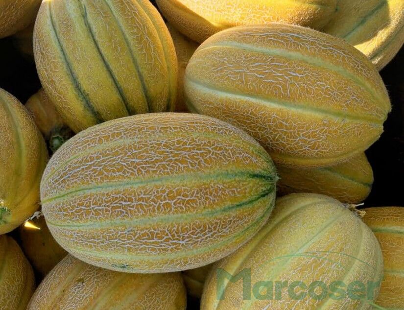 Fructele sunt pot ajunge pana la greutatea de 4 kg, au o culoare galben portocaliu, forma eliptica prelungita. Acestea sunt slab nervurate si acoperite cu ochiuri fine.