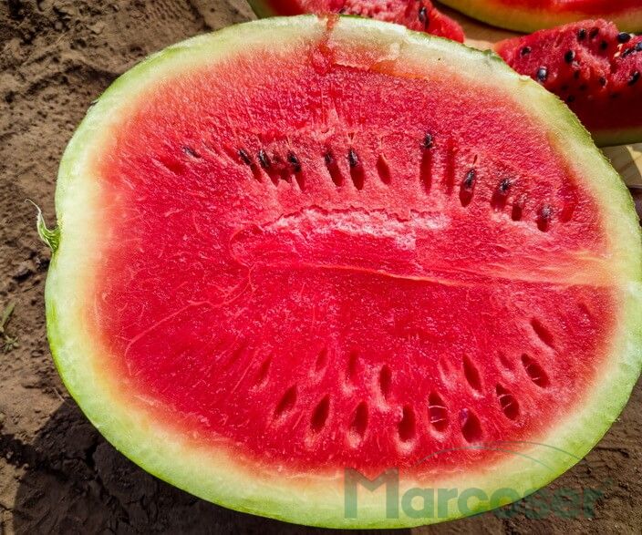 Fructele sunt rotunde, au o greutate medie de 7-8 kg. Miezul este rosu si crocant.